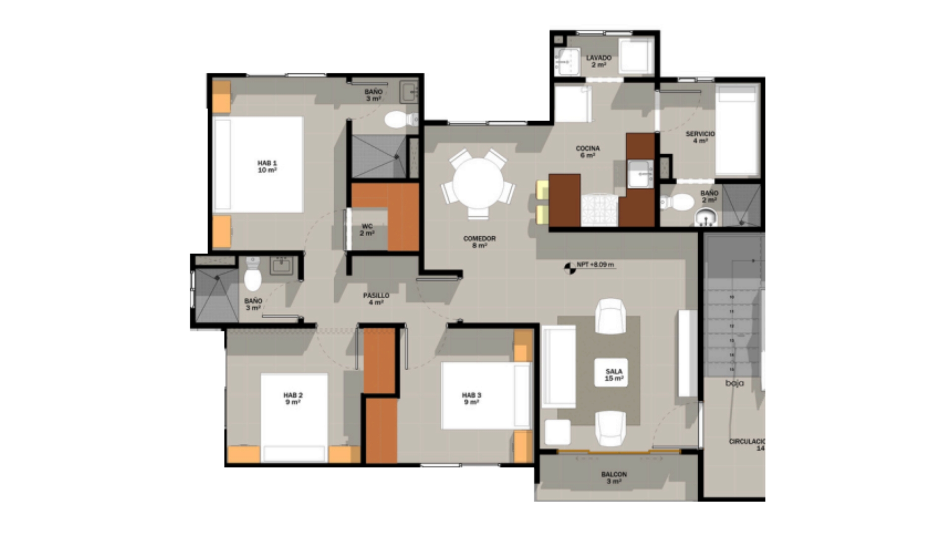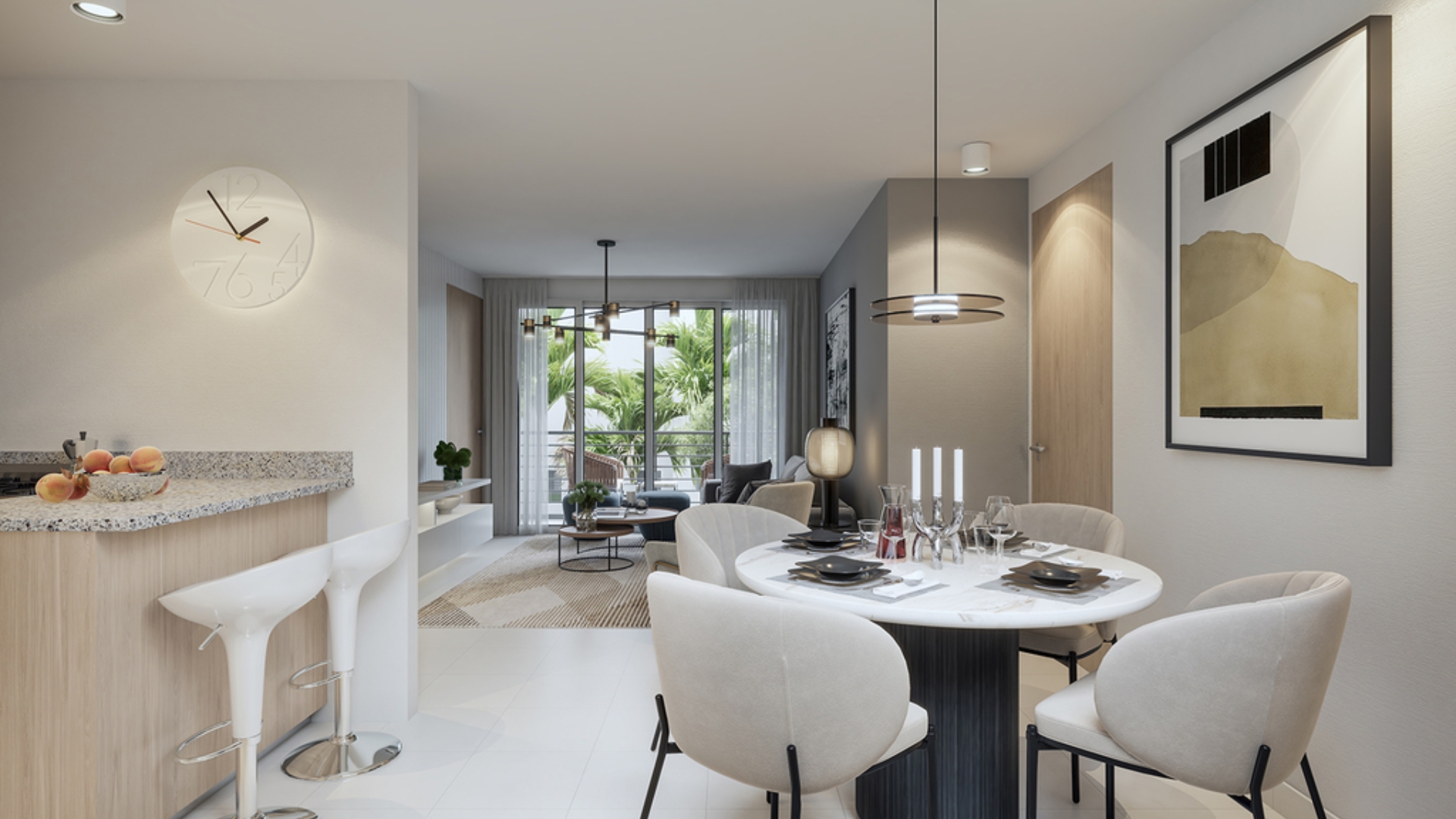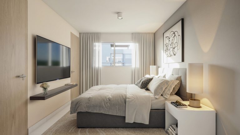 incluye una habitación principal con baño privado y walk-in closet, dos habitaciones secundarias, baño compartido, sala-comedor integrada, cocina moderna, área de lavado, balcón y parqueo. Además, cada apartamento cuenta con habitación de servicio con baño. Algunas unidades incluyen terraza exclusiva en primer nivel o azotea privada en el cuarto piso,
