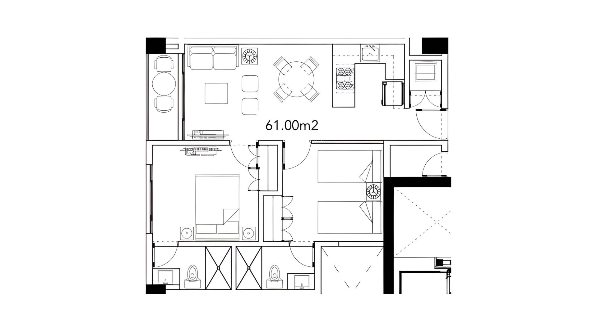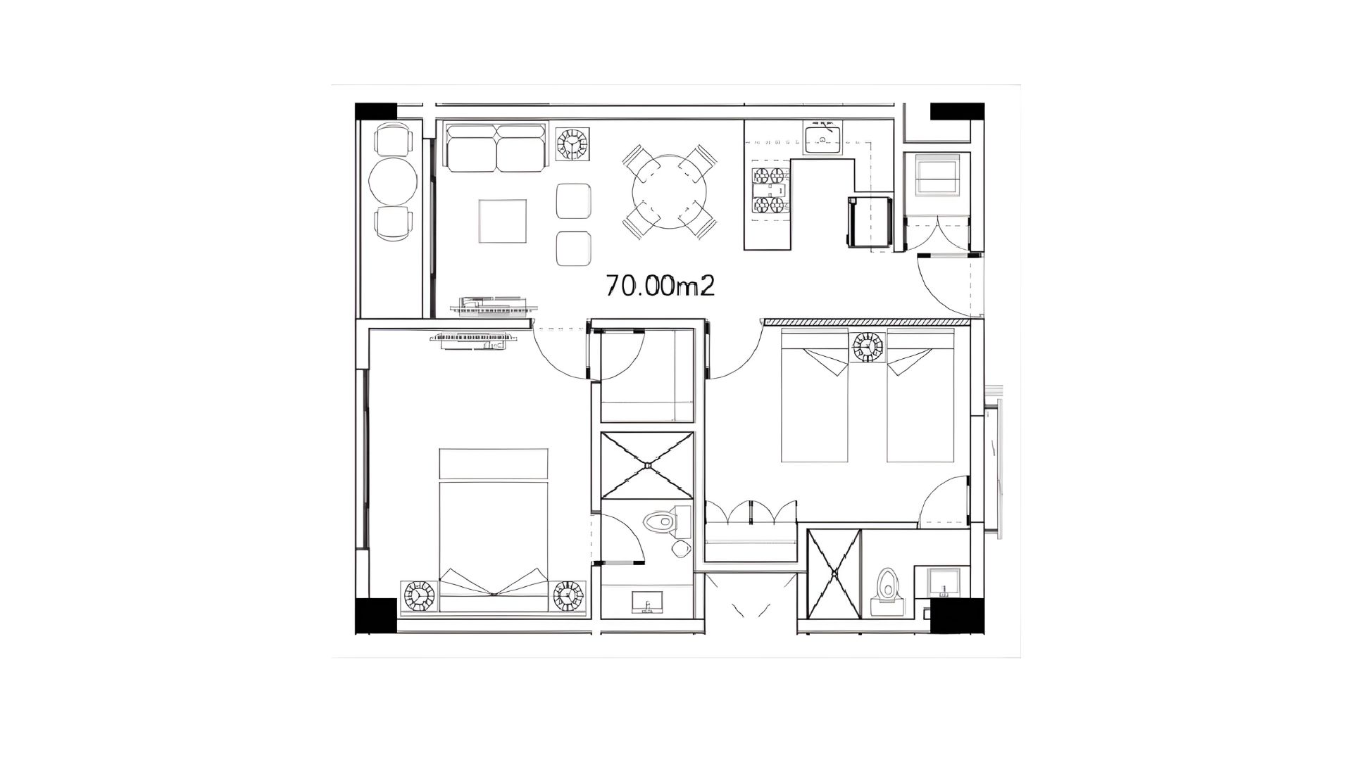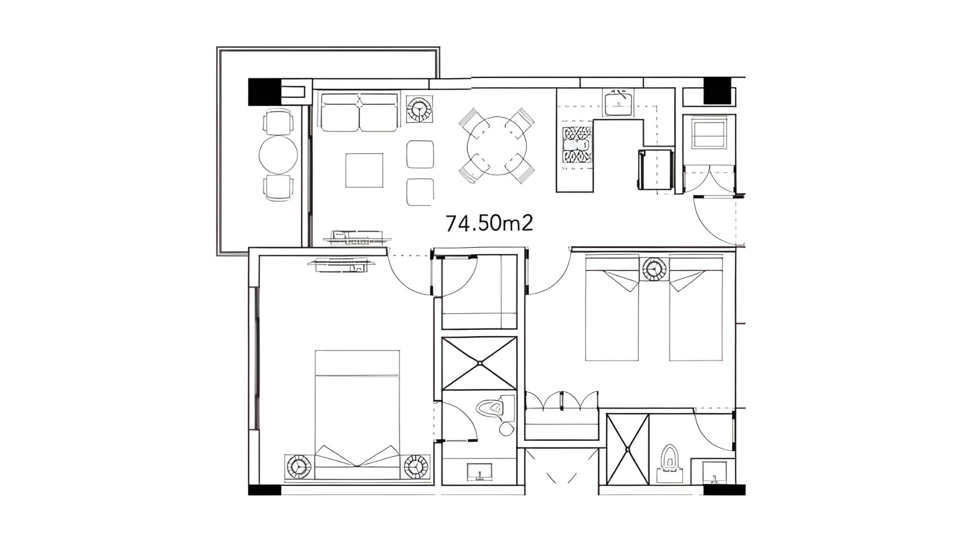 • Sala - Comedor • Cocina modular • Área de lavado • 2 habitaciones • Walking closet en habitación principal • 2 baños • Balcón tipo terraza